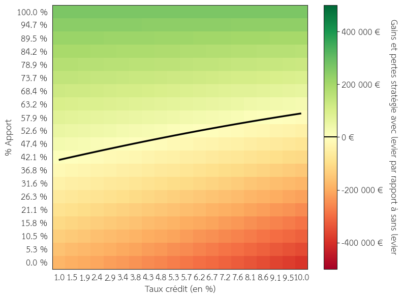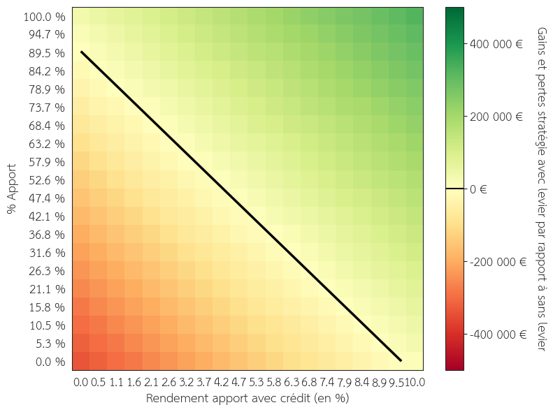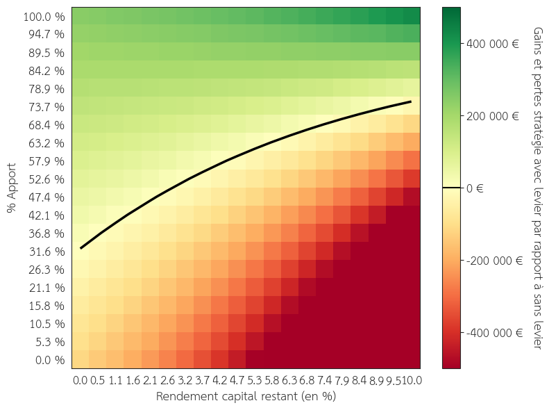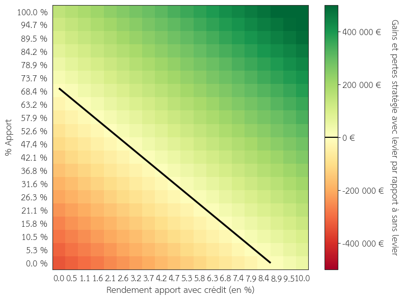 Dans cet article, j’ai cherché à répondre à la question : combien mettre d’apport pour un achat immobilier ? J’ai proposé un cadre plus général de réflexion autour de l’effet de levier. Au travers de graphique nous avons pu voir que l’utilisation de l’effet de levier n’est pas un moyen d’enrichissement garanti et qu’il est nécessaire d’avoir un capital minimal à apporter en apport tout en privilégiant un placement avec de bonne performance par rapport au capital.