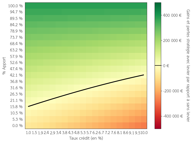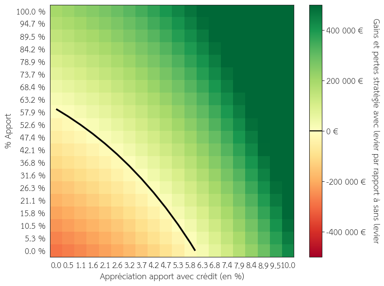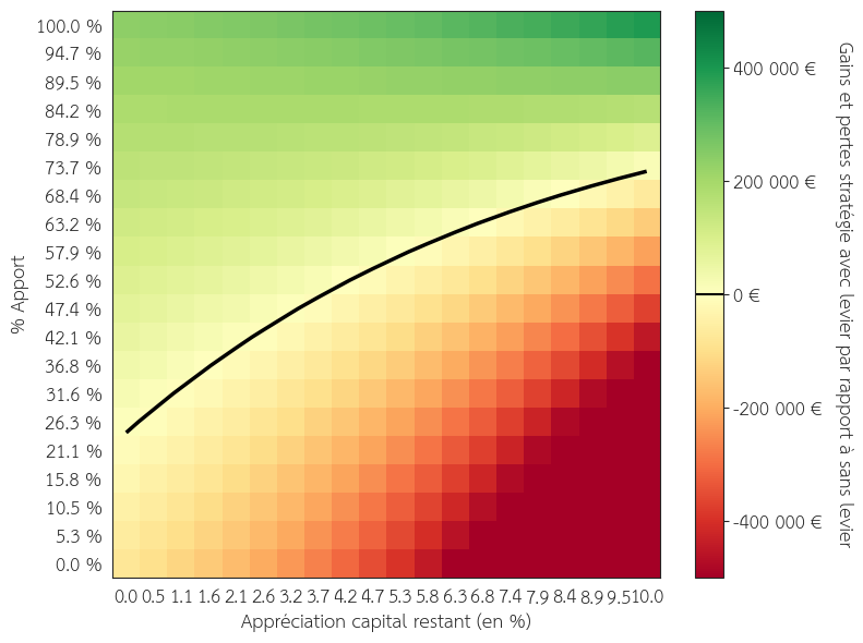 Comme pour l’étude de l’impact sur l’évolution du rendement sur l’apport avec le crédit, nous pouvons voir que l’appréciation de l’apport est une variable déterminante. Empiriquement, nous pouvons constater qu’investir à crédit nécessite de s’assurer que l’argent investi aura une rentabilité supérieure à la rentabilité du capital investi sans levier plus une marge qui sera déterminée en fonction du taux du prêt..
