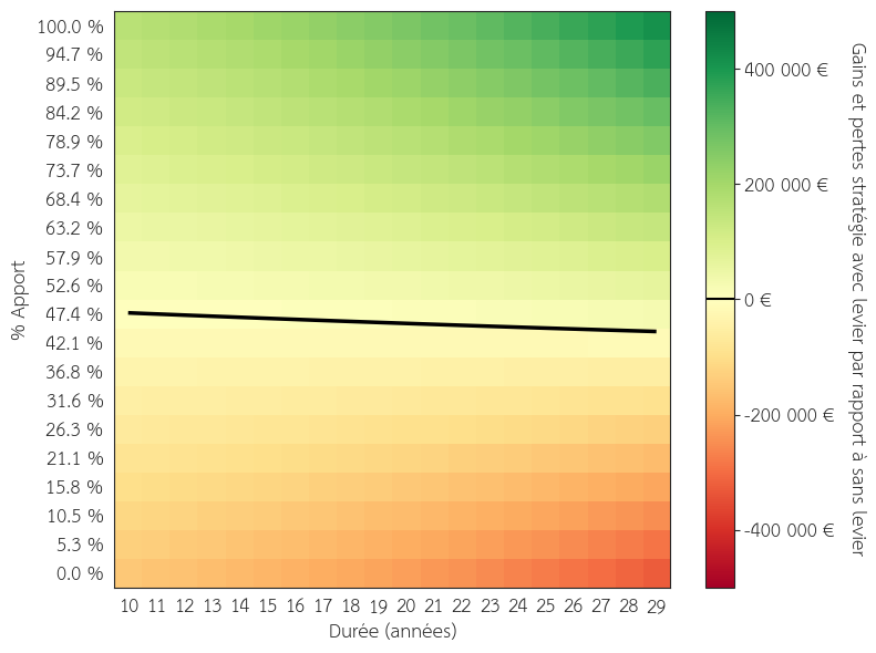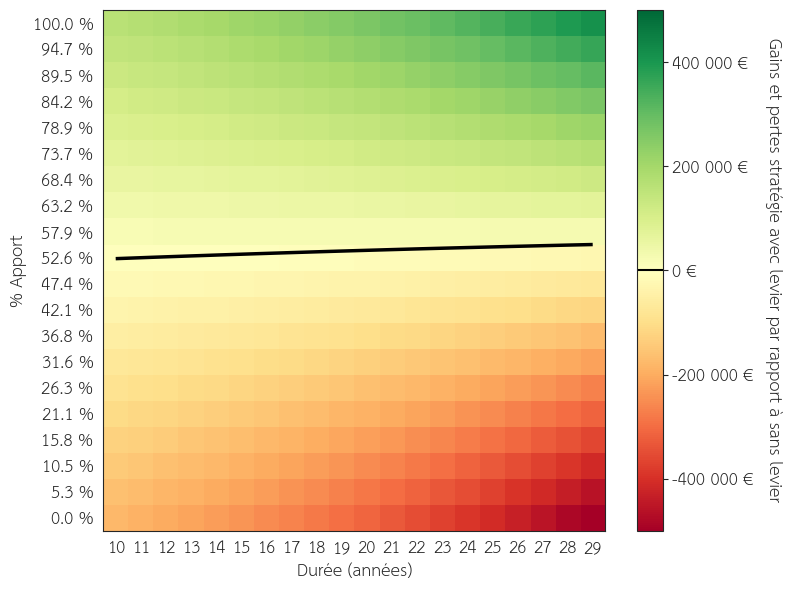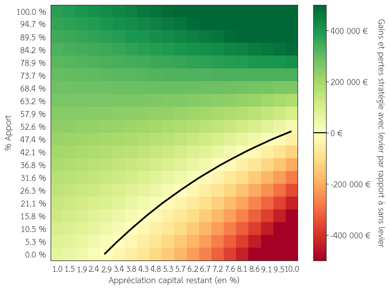 Le CAC40 en “Price Return” (sans inclure les dividendes) à fait 430 % au total soit 4,9% par an en moyenne sur la même période (1991-2026). Nous allons refaire une simulation en considérant ces variables et en conservant un taux du prêt à 3 % par an. La Figure 11 montre l’ écart de performance en pourcentage en fonction de l’appréciation annuelle du capital restant et du pourcentage du capital en apport par rapport à celui ciblé en prenant en considération l’imputation liée aux loyers.