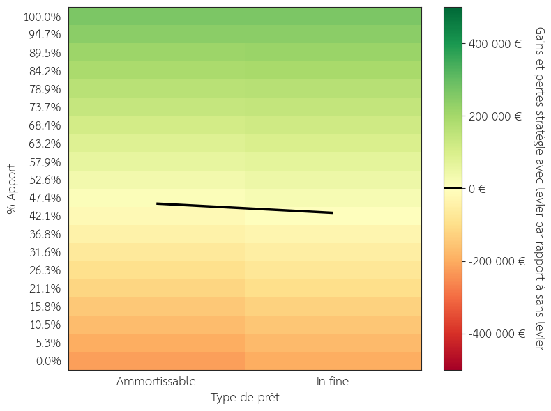 Il n’y a pas de différence entre investir avec un crédit in-fine ou un crédit par amortissement avec les paramètres actuels car le taux du prêt est proche de la rentabilité utilisée. Dans notre cas, nous considérons le rendement constant, c’est donc l’appréciation du capital ou de l’apport et du crédit qui permet d’accroître celui-ci. Plus cette appréciation est importante par rapport au taux du crédit et plus il devient intéressant d’emprunter sous la forme d’un prêt in-fine. Autrement dit, la pente descendante représentée par la ligne noire devient de plus en plus forte.