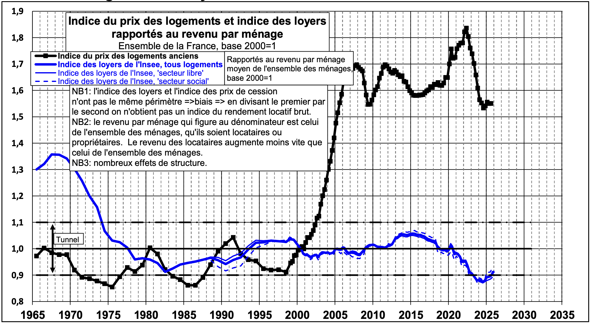 Figure 1 : Évolution de l’indice des prix des logements et des loyers en France entre 1965 et 2025. Source : Jacques Friggit.