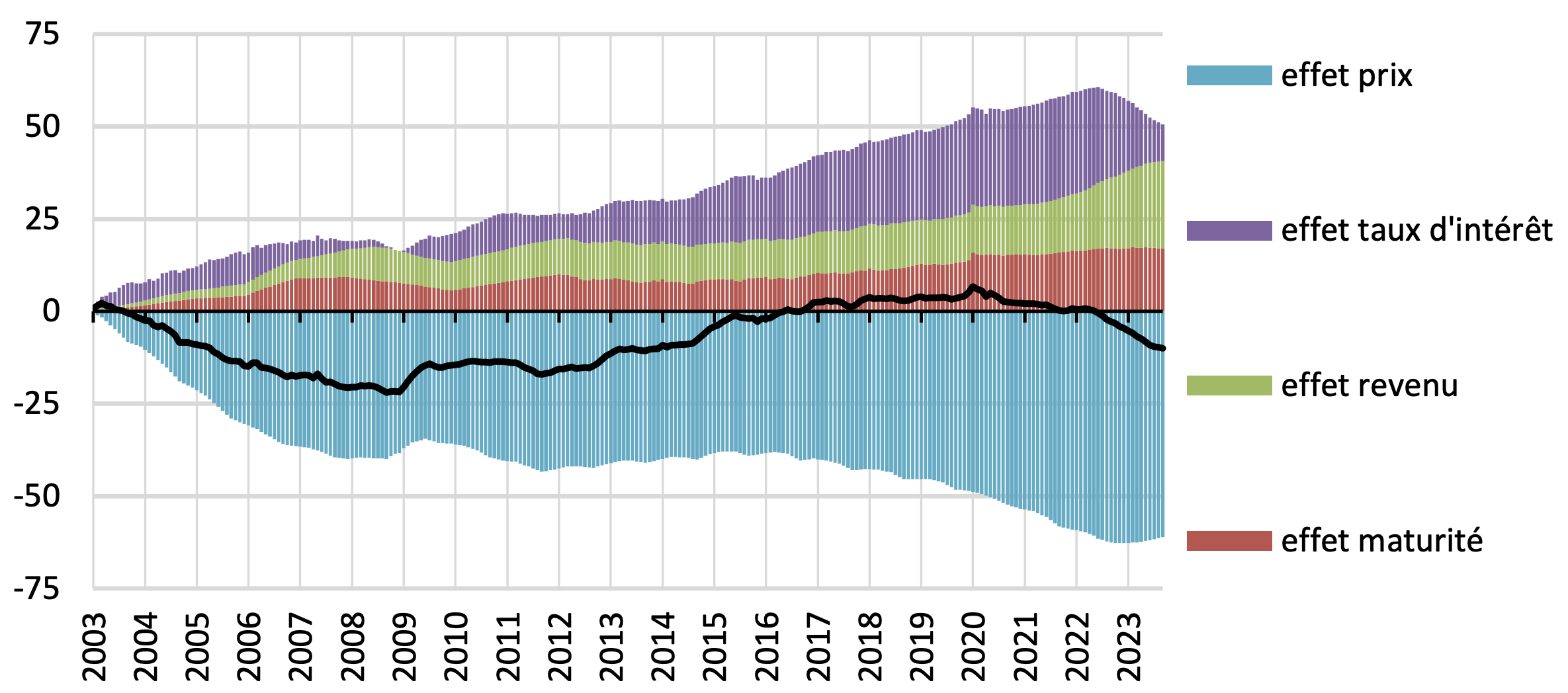 Figure 4 : Évolution sur 20 ans, entre 2003 et 2023 du pouvoir d’achat immobilier des ménages et de ses principales causes. Sources : Sénat, Banque de France, INSEE.