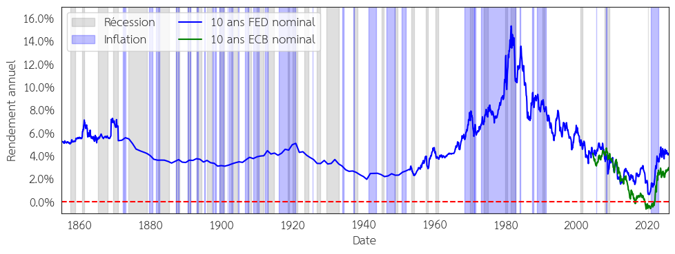 Figure 1 : Évolution du taux sans risque en Europe (entre les années 2004 et 2025) et aux États-Unis (entre les années 1954 et 2025). Sources : FRED, Robert Shiller, ECB Data Portal.