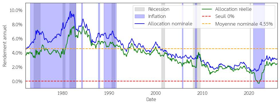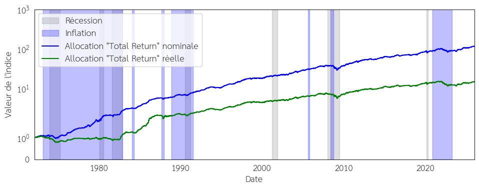 Figure 2 : Rentabilité nominale et réelle du portefeuille avec l’allocation présentée entre les années 1972 et 2026. Sources : FRED, Robert Shiller, Yahoo finance, FED, NAREIT.