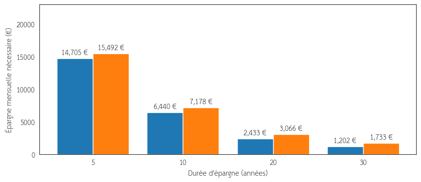 Le temps nécessaire est déjà moins important à niveau d’épargne équivalent. Autrement dit, pour la même durée de temps il est nécessaire de mon épargner mensuellement pour atteindre la même somme. Cependant, la somme mensuelle reste conséquente et ce niveau d’épargne n’est pas accessible à tout le monde.