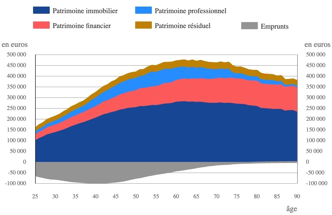 Ces chiffres restent cohérents avec le parcours de vie d’une personne du haut de la classe moyenne (médecin, avocat, artisans, …) ayant fini de rembourser son prêt immobilier et ayant également accumulé une épargne au cours de sa vie grâce au revenu de son entreprise. Cela se confirme en regardant la distribution du patrimoine par ménage. La Figure 6 illustre la composition du patrimoine brut en fonction des ménages en fonction de l’âge de la population.